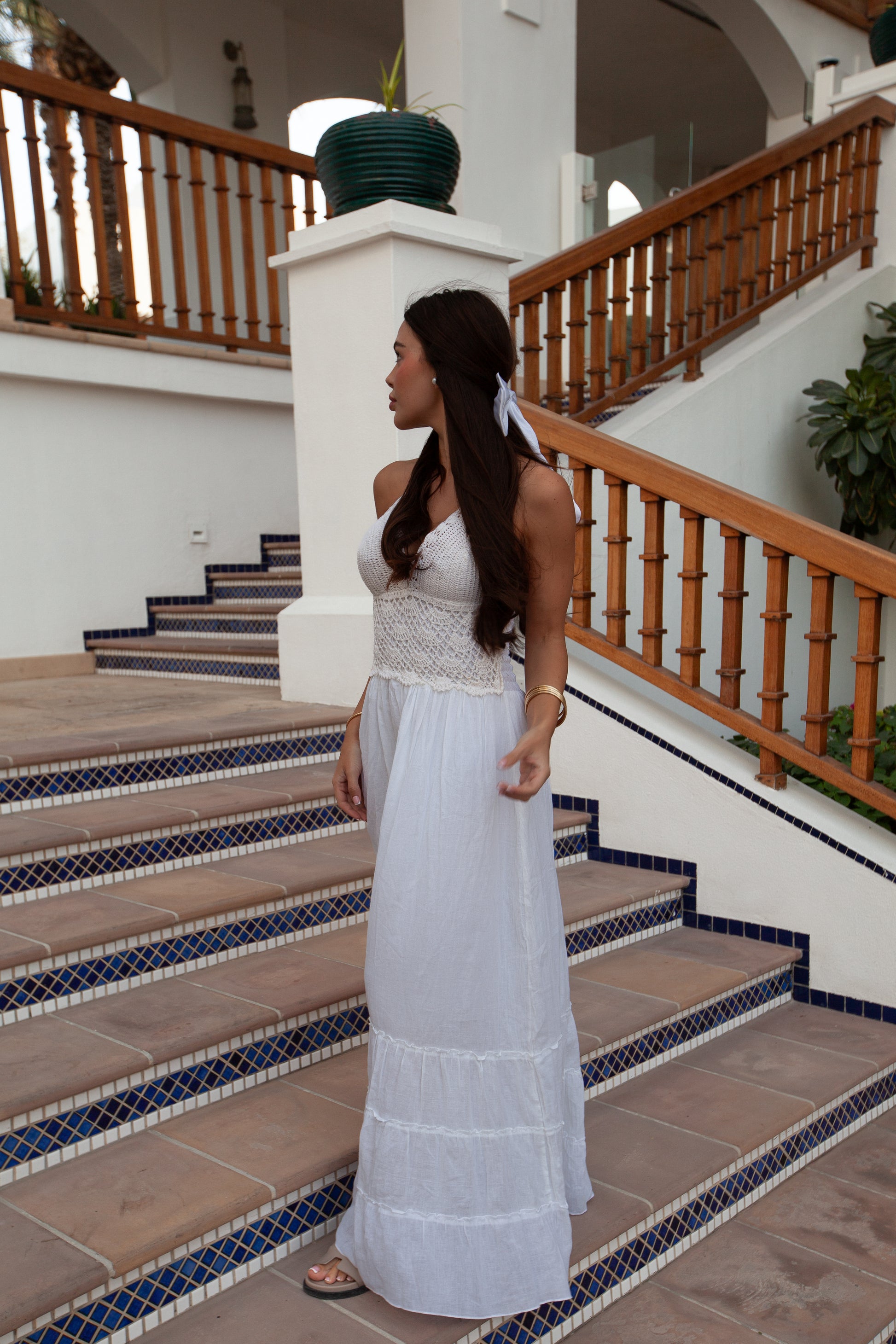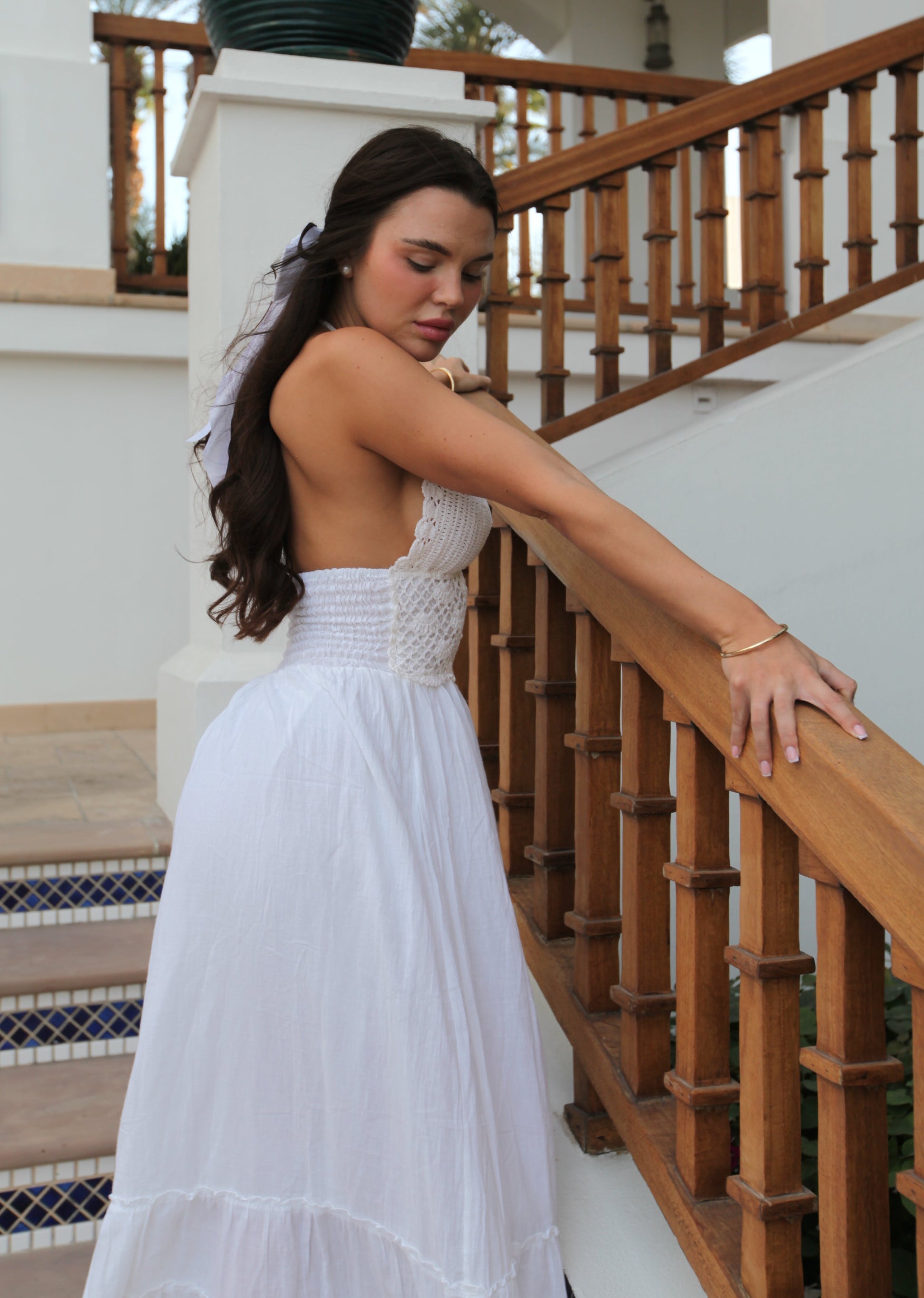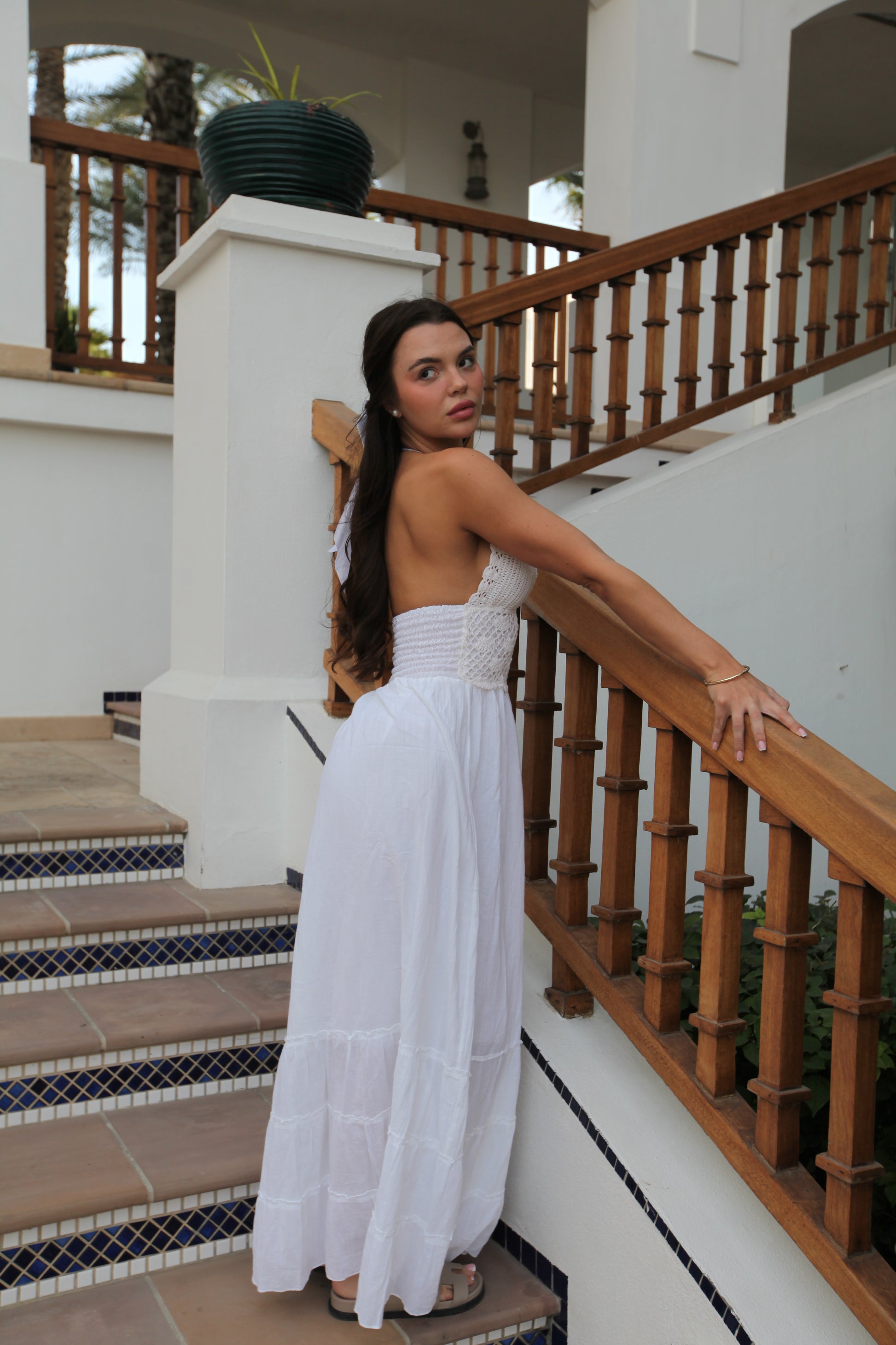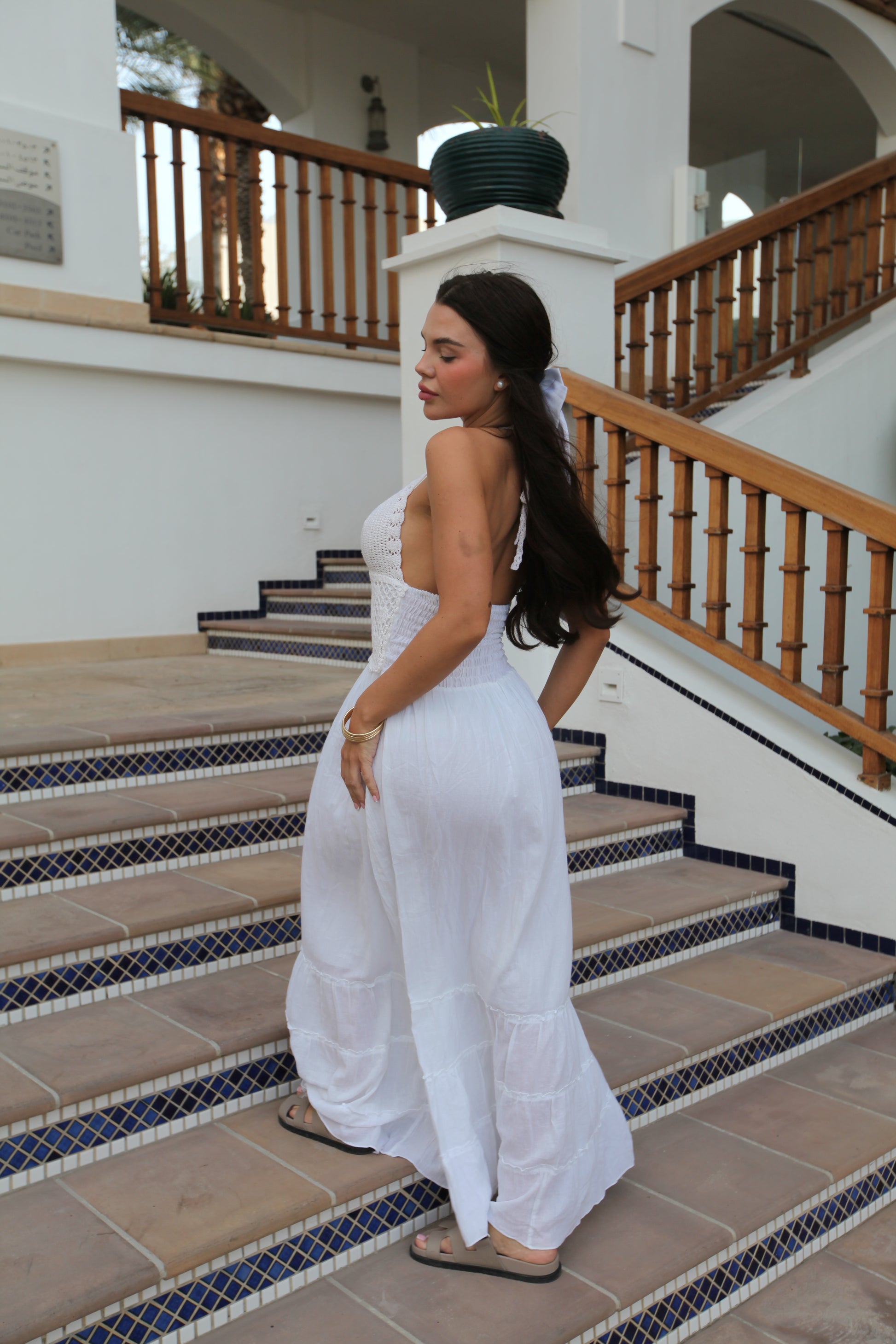 Embrace your natural beauty with this embroidered halter neck, flowy dress. A stunning piece designed for effortless elegance.