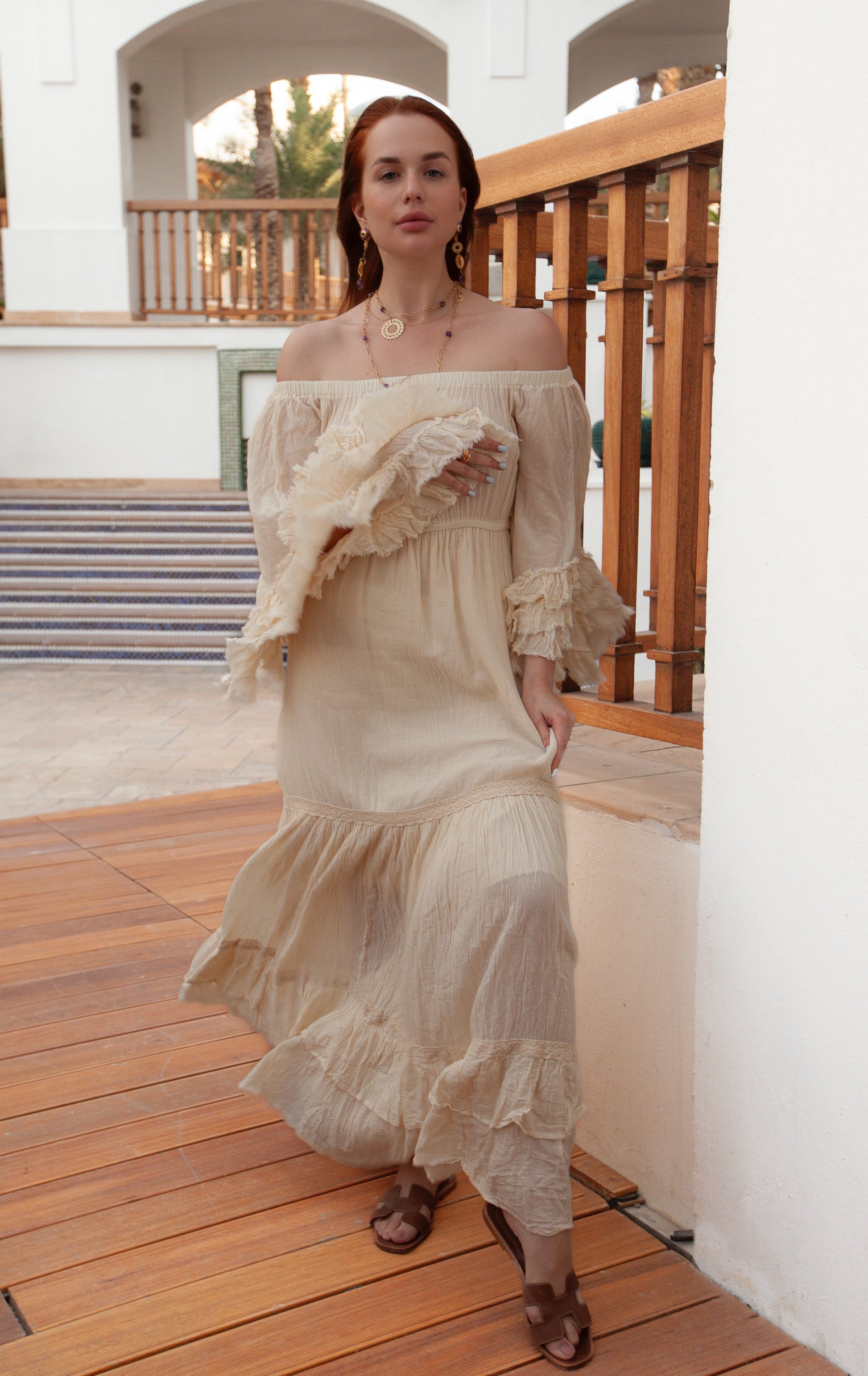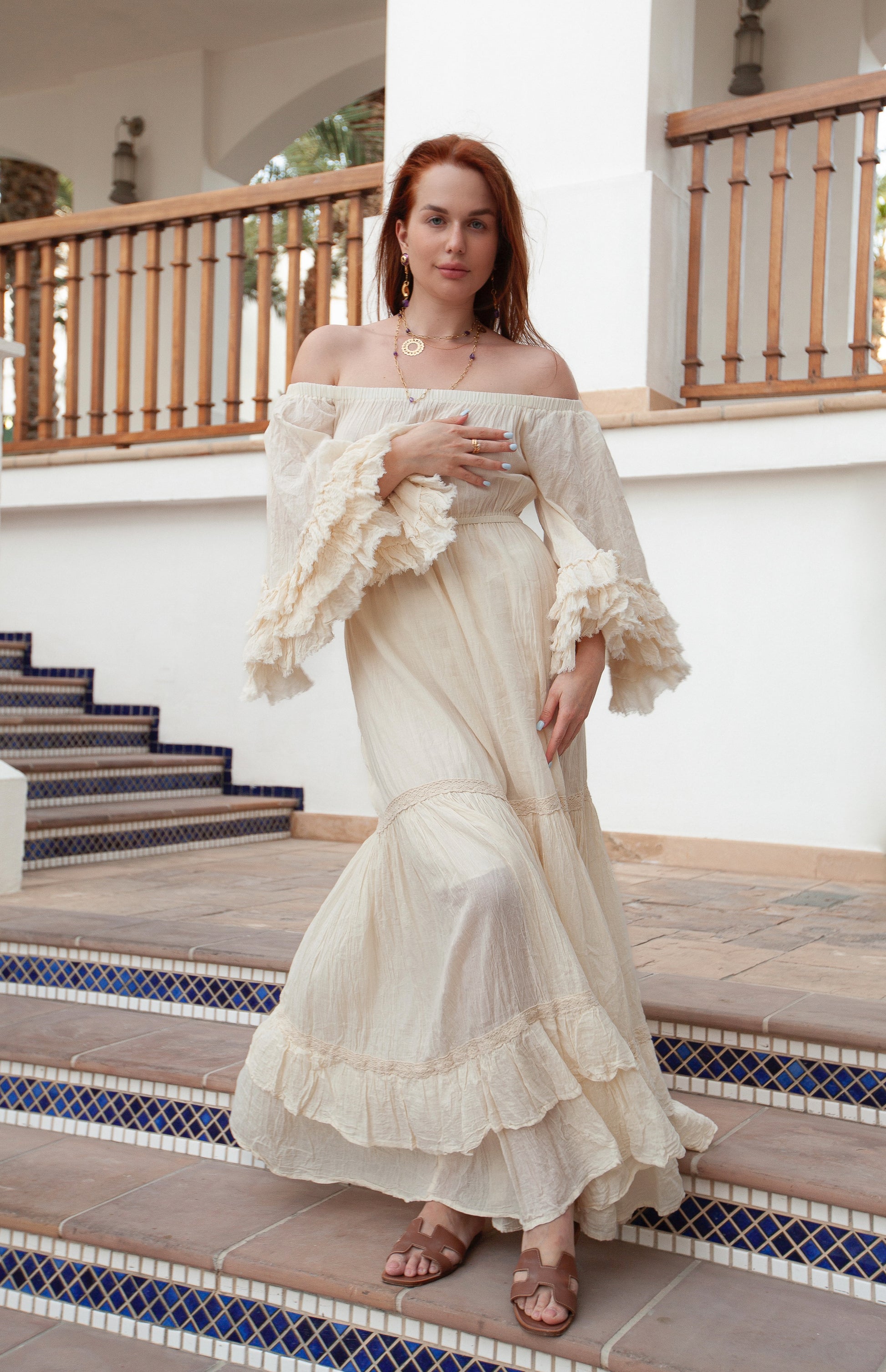 Capture the essence of Spanish elegance in this long, flowy off-shoulder dress. A stunning piece handcrafted from 100% organic cotton.